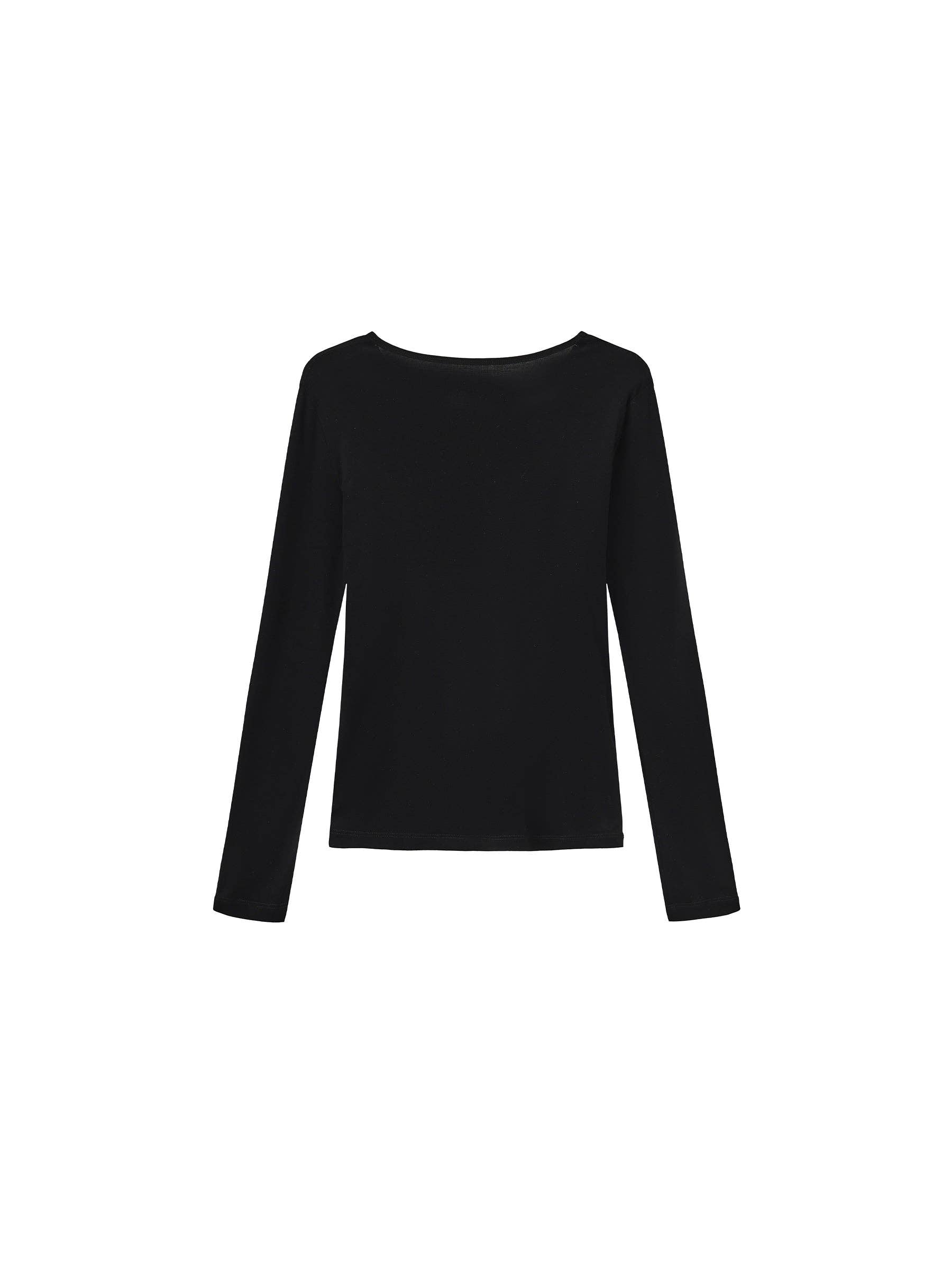 Basic long-sleeve layering top in black/white/gray. Designed with a straight-cut silhouette and clean shoulder line. Available in three neckline options. Minimalist and versatile, ideal for effortless layering. The fabric composition is 84.7% Lyocell, 12.7% Sheep Wool, 2.6% Spandex. Model wears size M, which is suitable for UK size 10. Product Code: CCBET6013