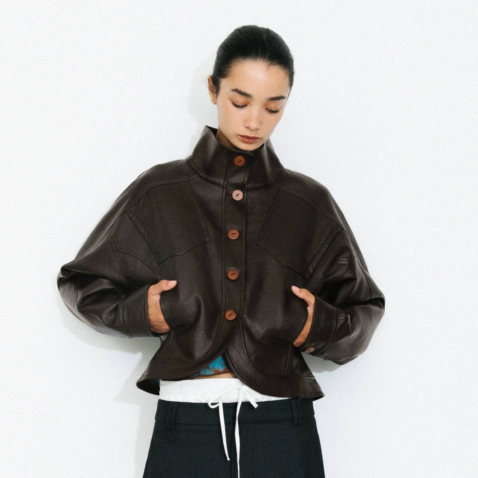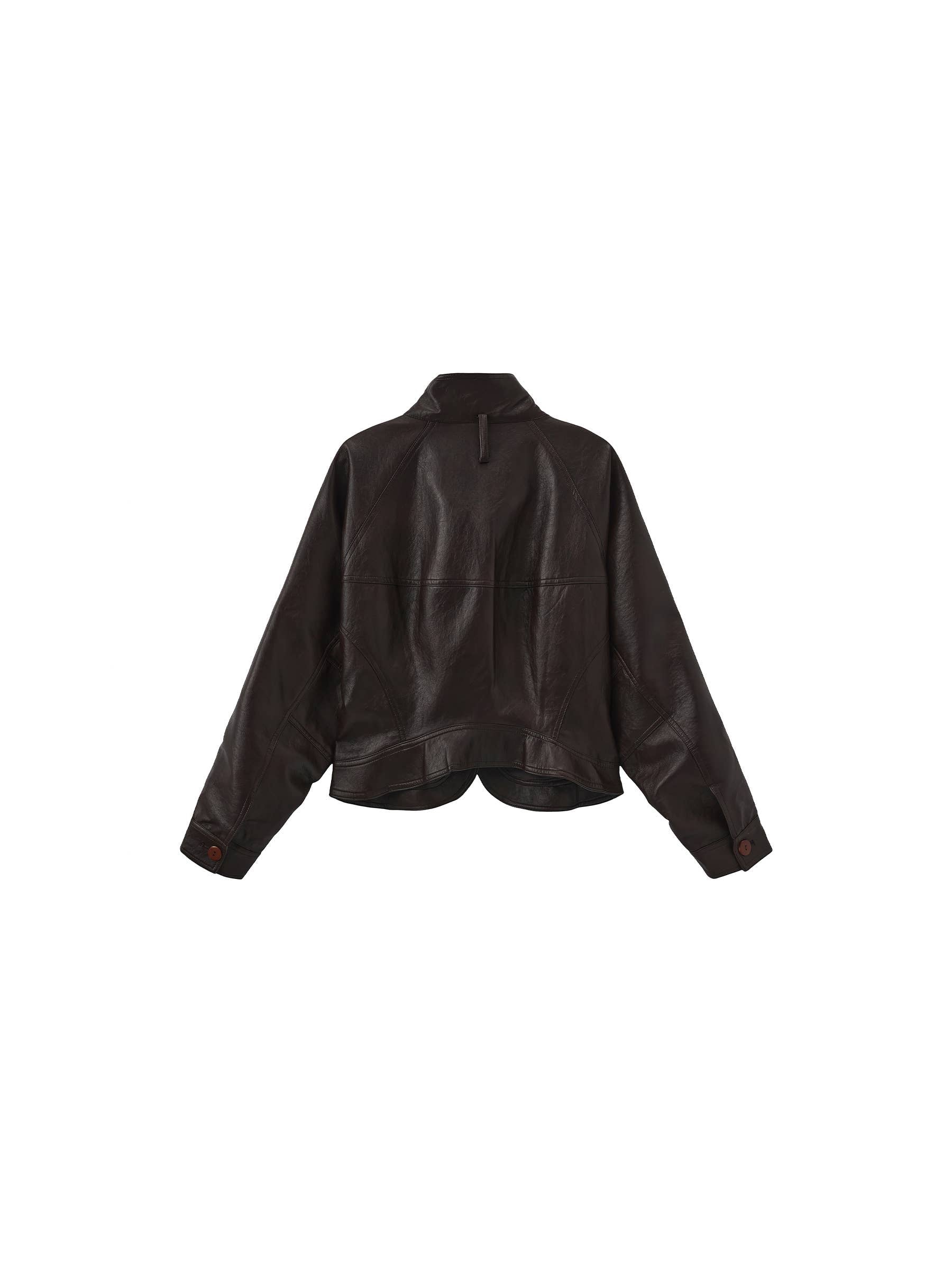 Curved sleeve faux leather jacket in brown. Crafted from supple faux leather, this jacket features a stand collar and voluminous batwing sleeves with a curved silhouette. The cinched waist and sculpted hem create a flattering shape, while the three-dimensional cut ensures a bold, structured look.
