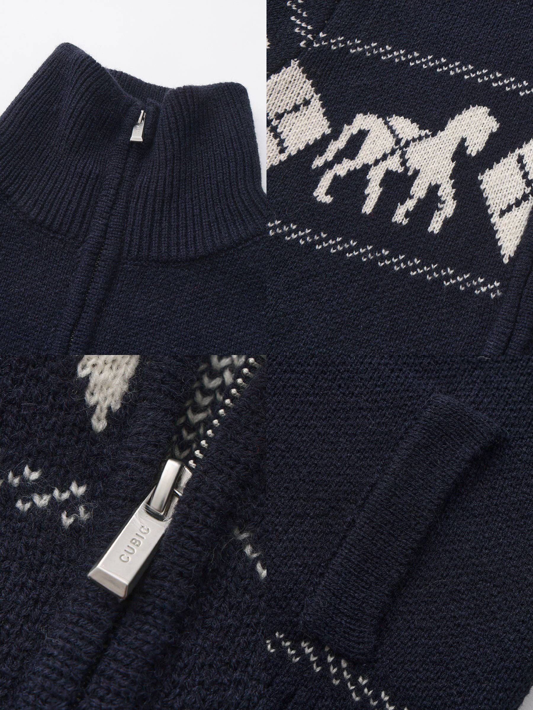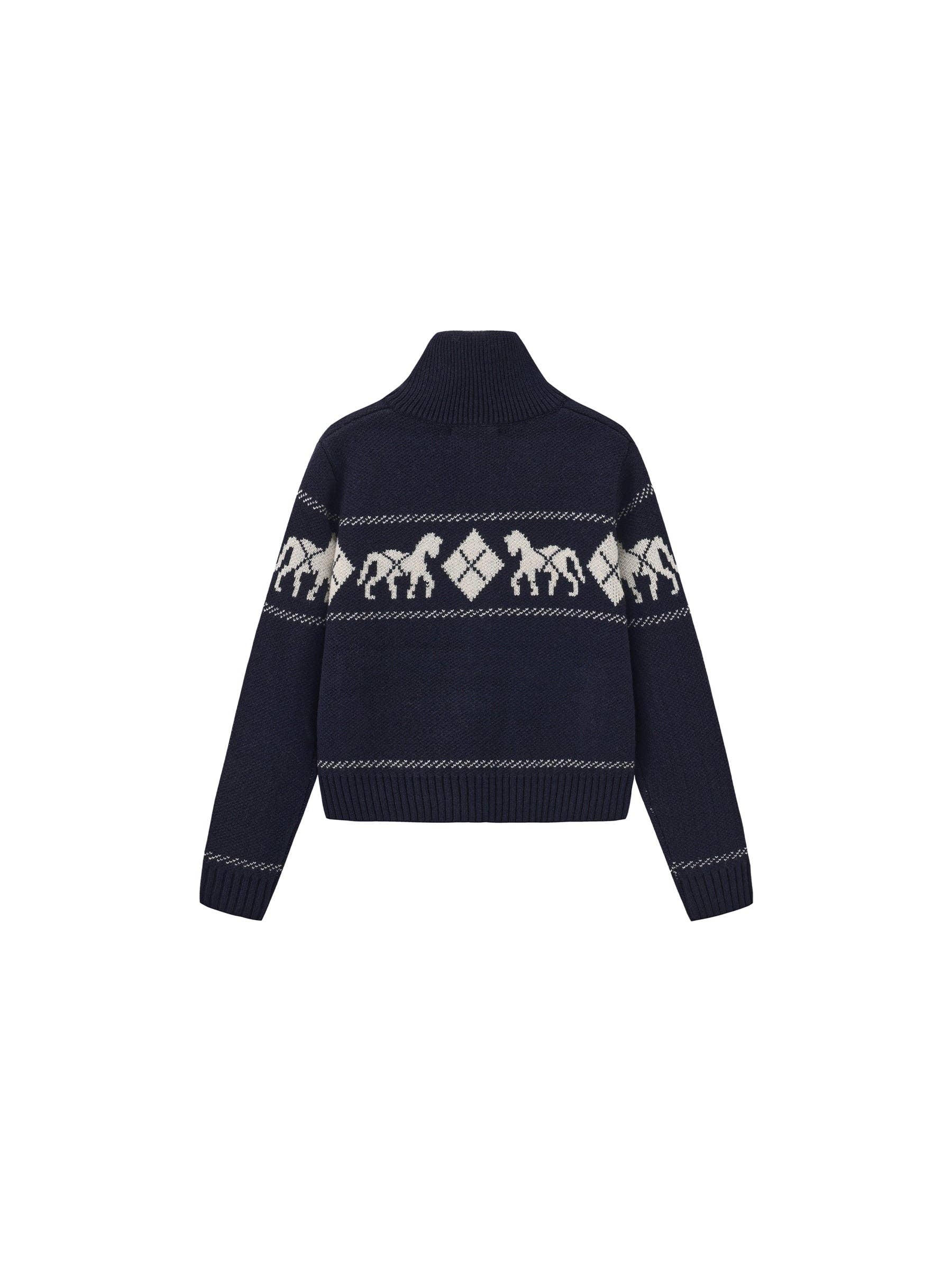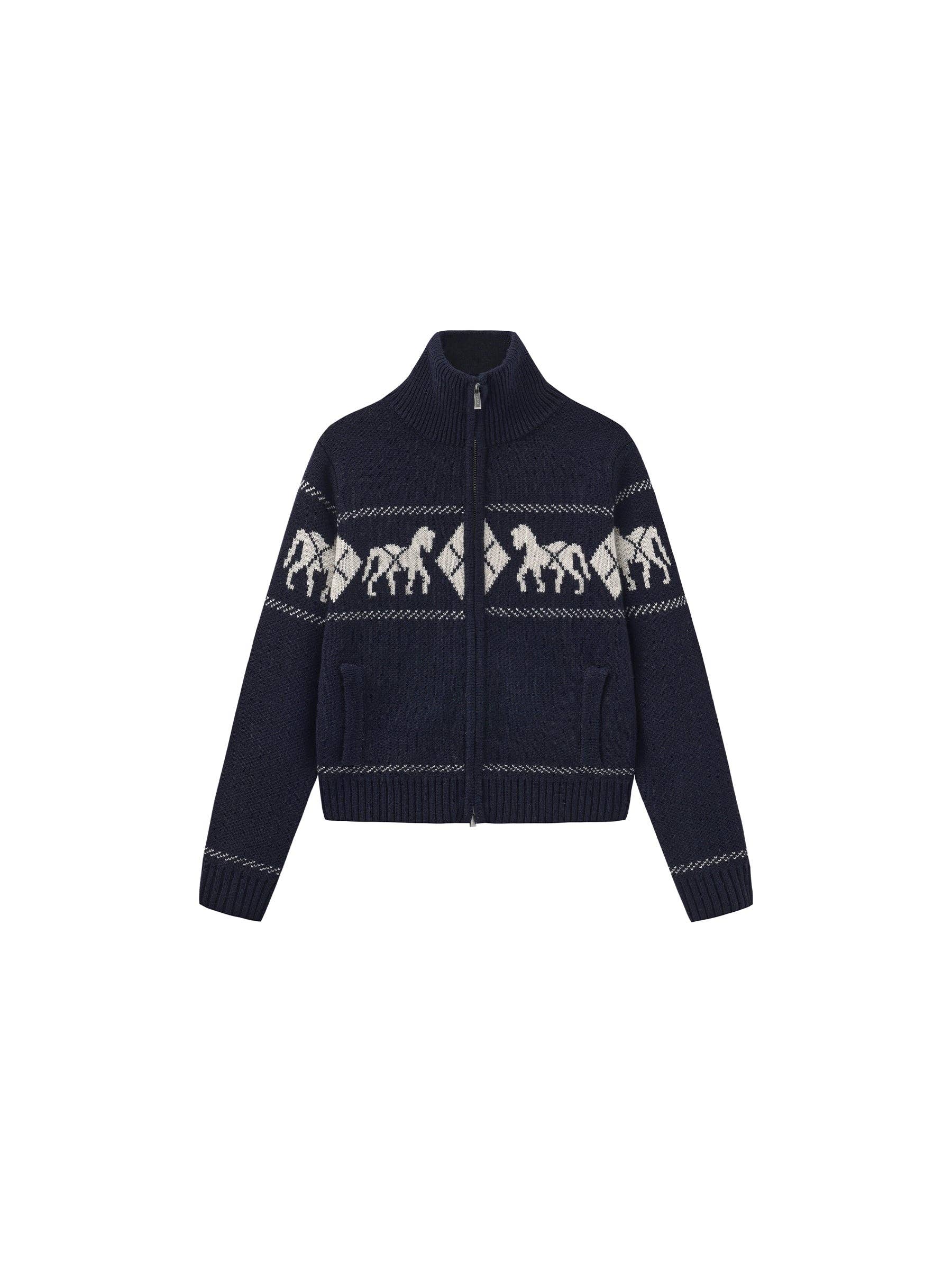 Horse Pattern Diamond Zip-Up Knit Cardigan