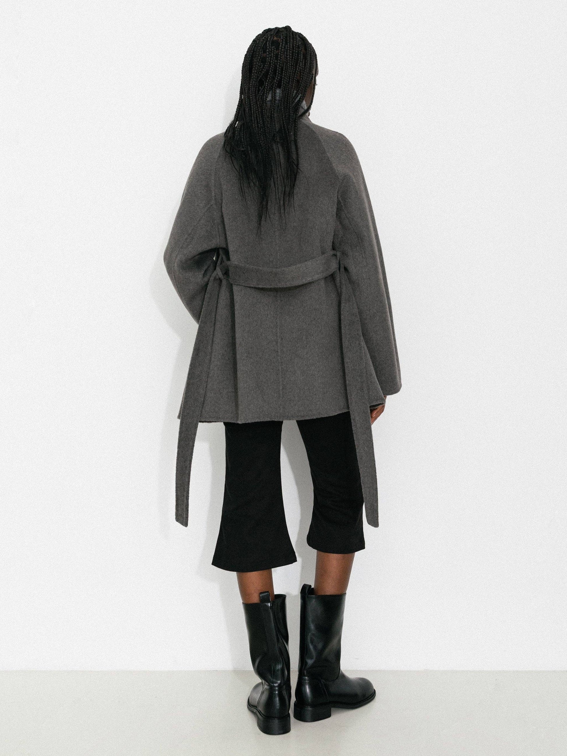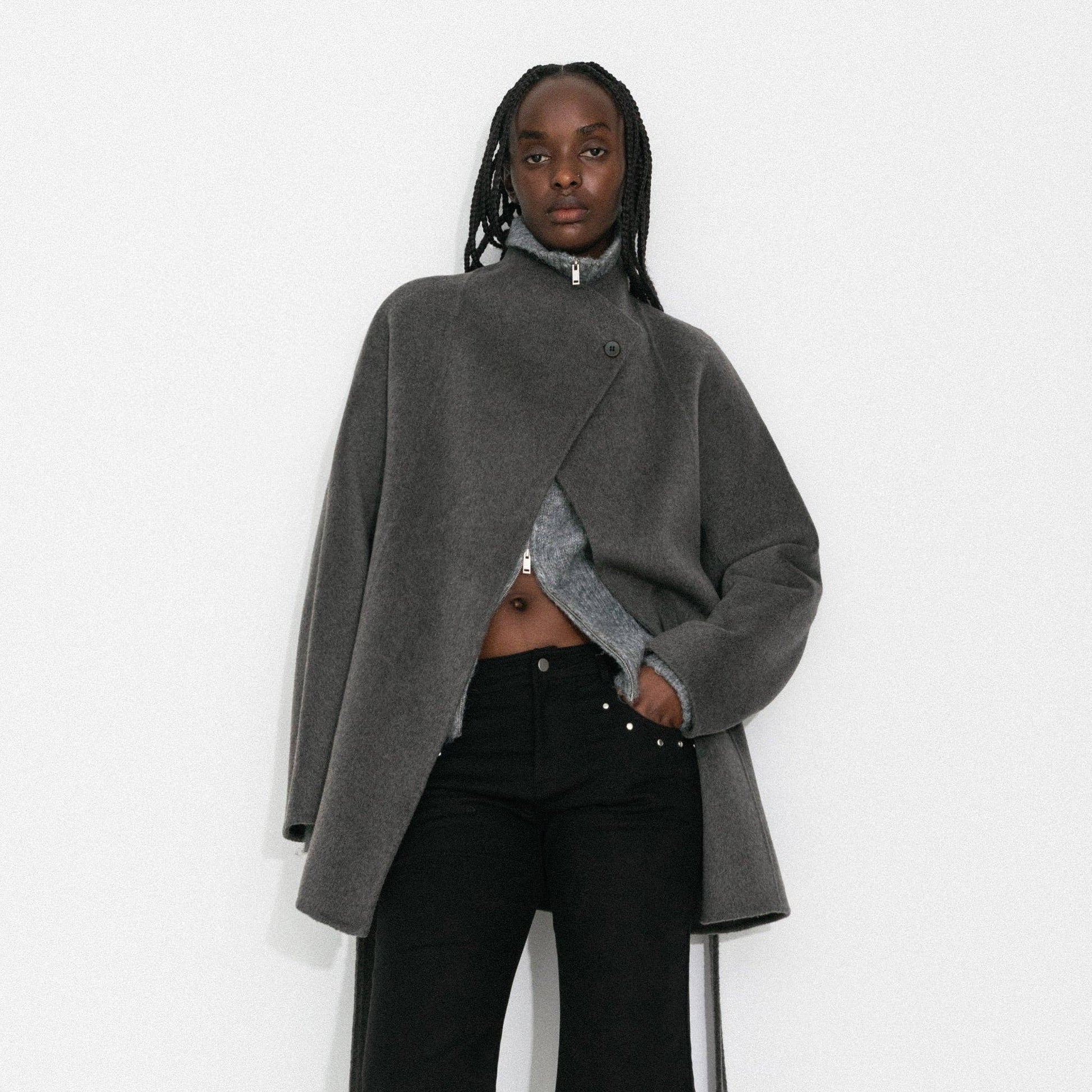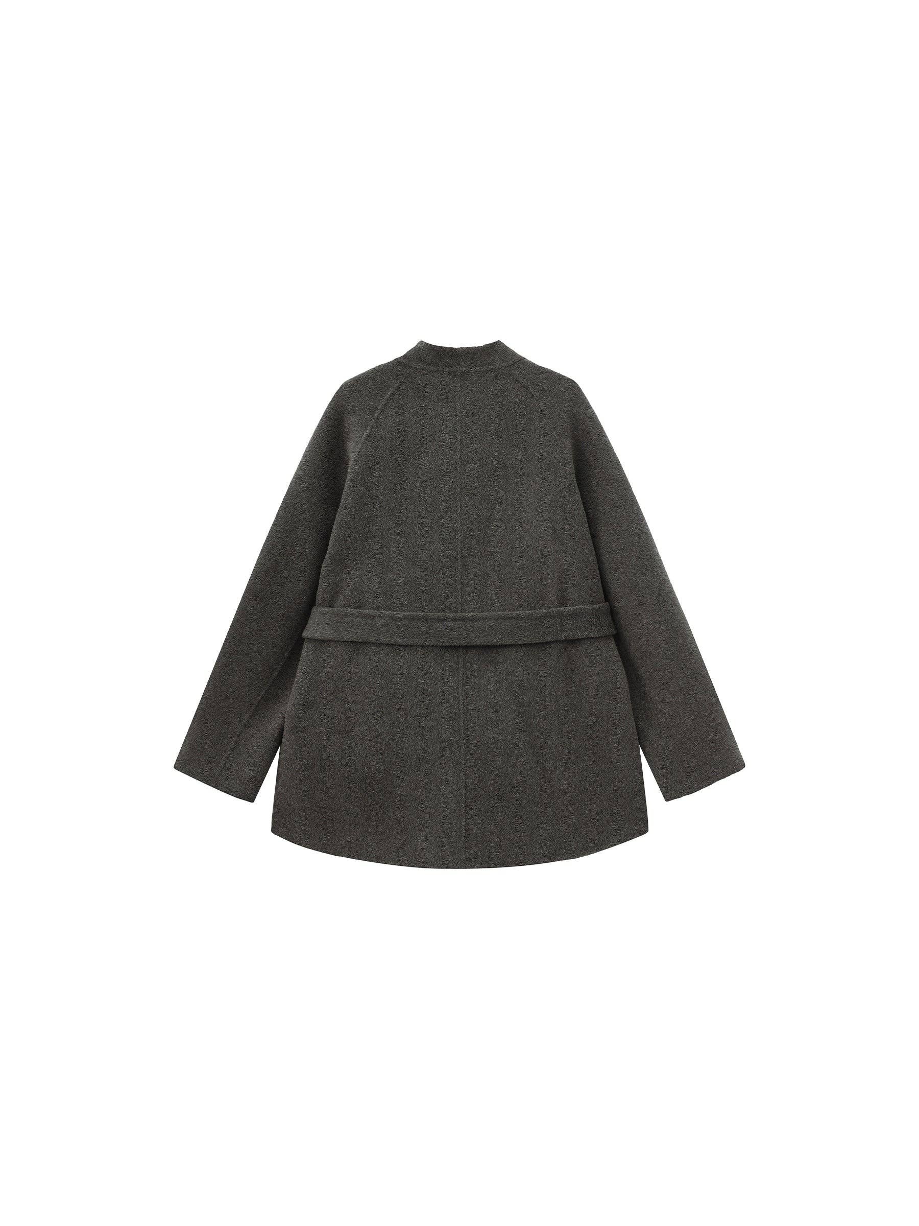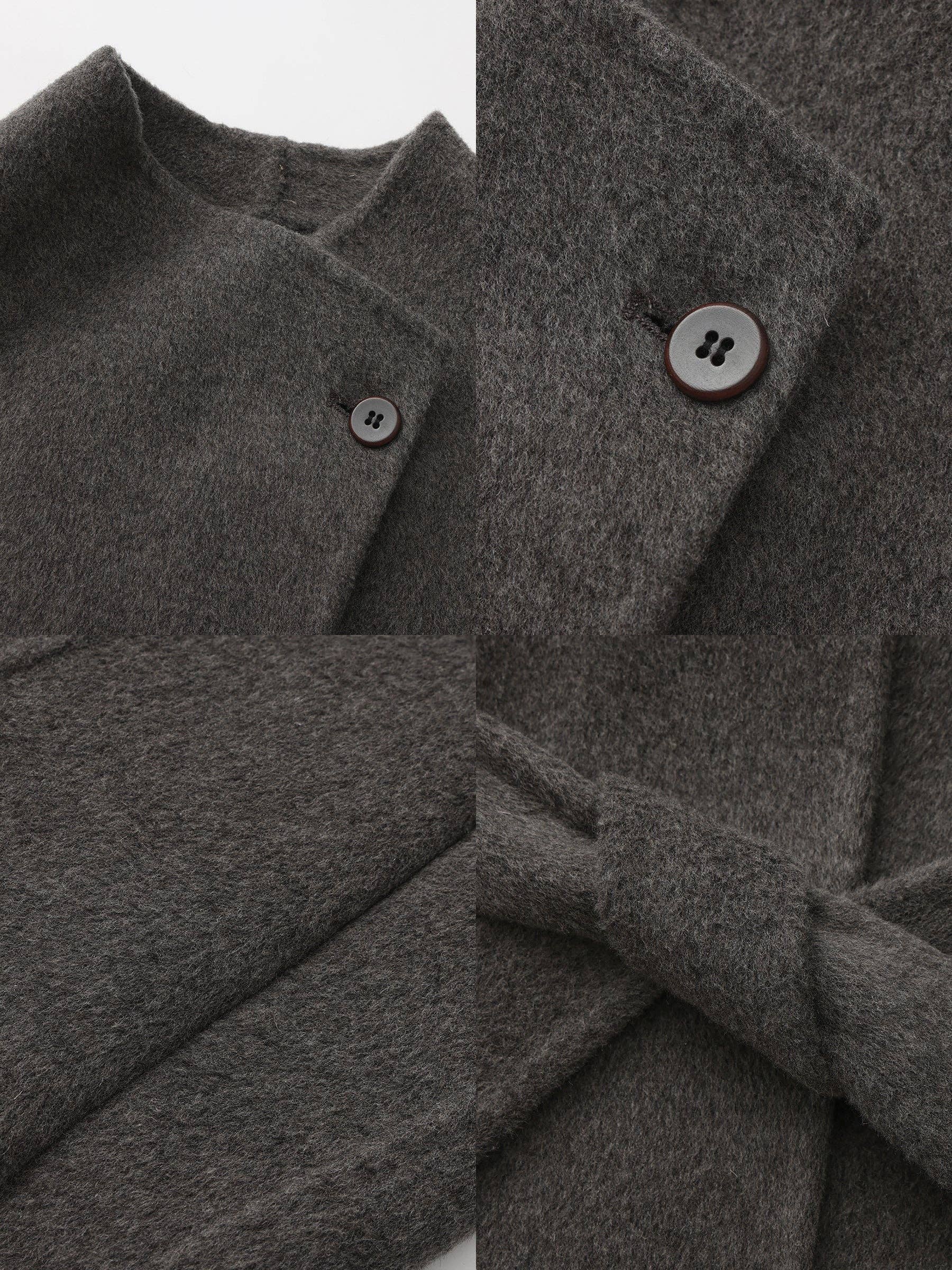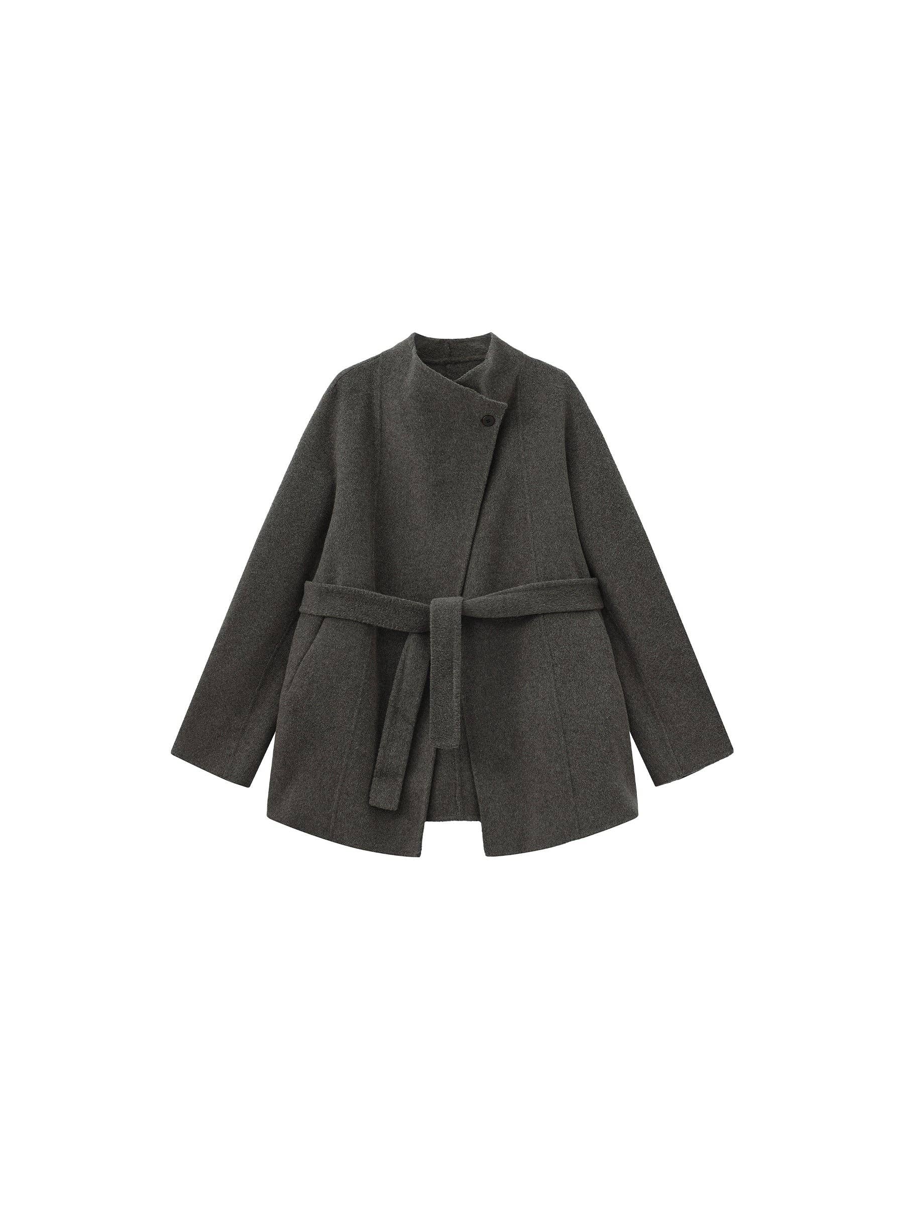 This A-line coat features a sleek stand collar for a polished, structured look. A single-button closure adds minimalist elegance while ensuring easy wear. The adjustable waist belt allows for a customized fit and versatile styling, combining practicality with refined, fashion-forward details.