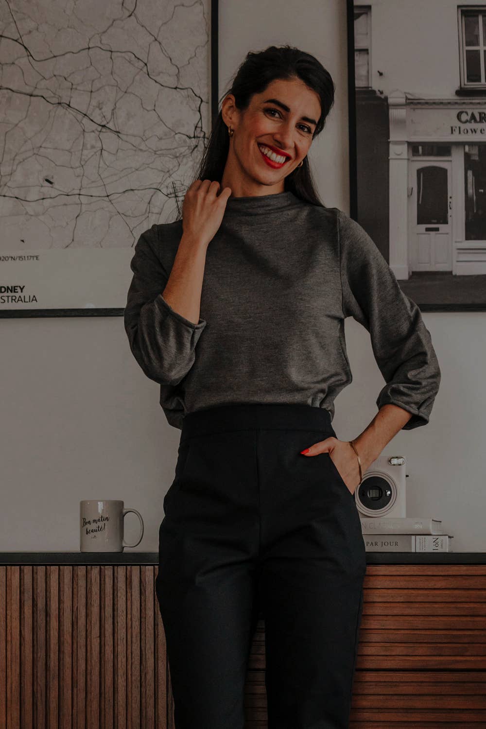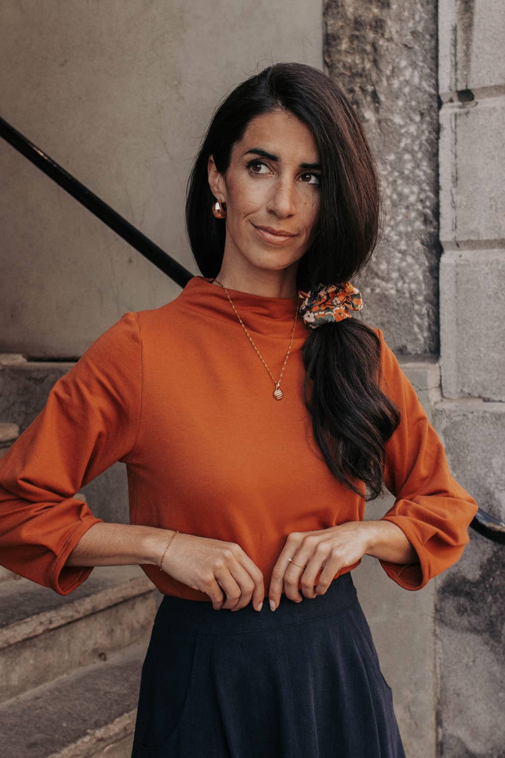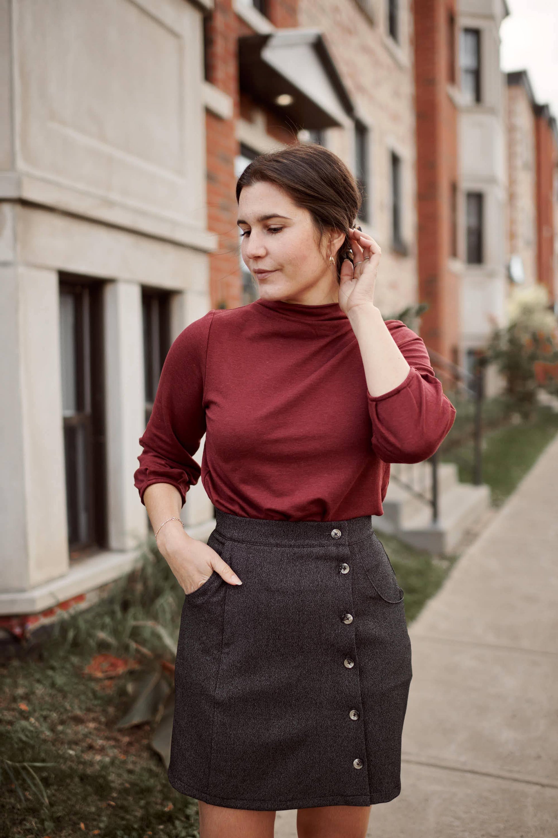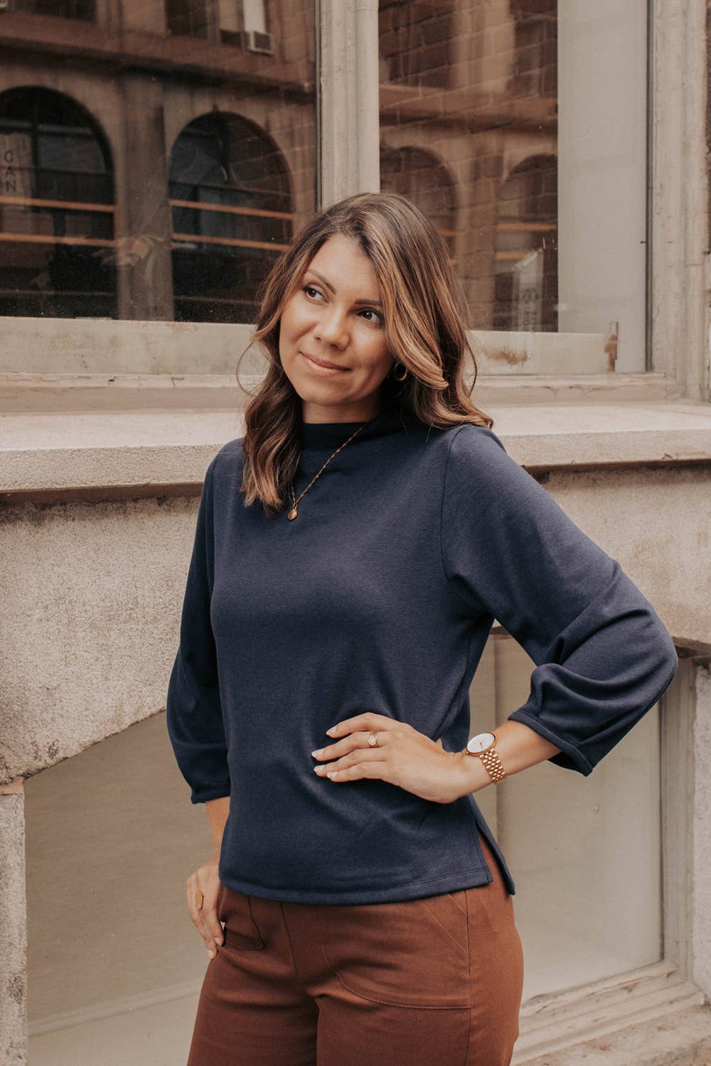 This sweater is comfortable and versatile, with delicate details and a sophisticated style. Bamboo Terry (67% Bamboo Rayon, 28% Cotton, 5% Spandex) Sustainable & perfect to keep you warm :)