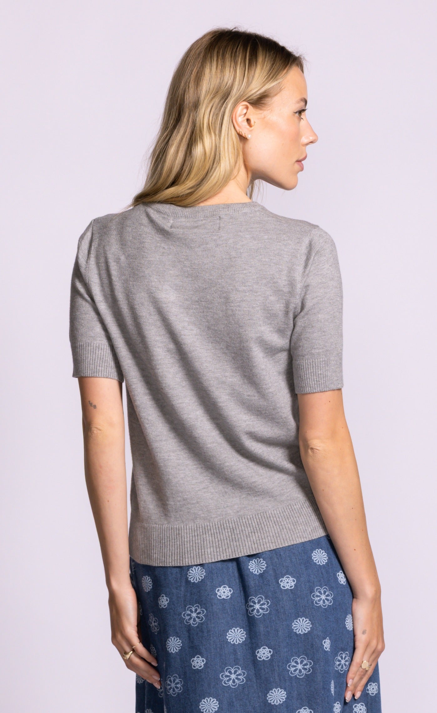 The Sandy Top is a soft knit basic with a round neck, short sleeves, and ribbed hem and cuffs. This short-sleeve sweater is designed with a relaxed fit. Simple yet super chic, style it with jeans or trousers for a casual workwear look.